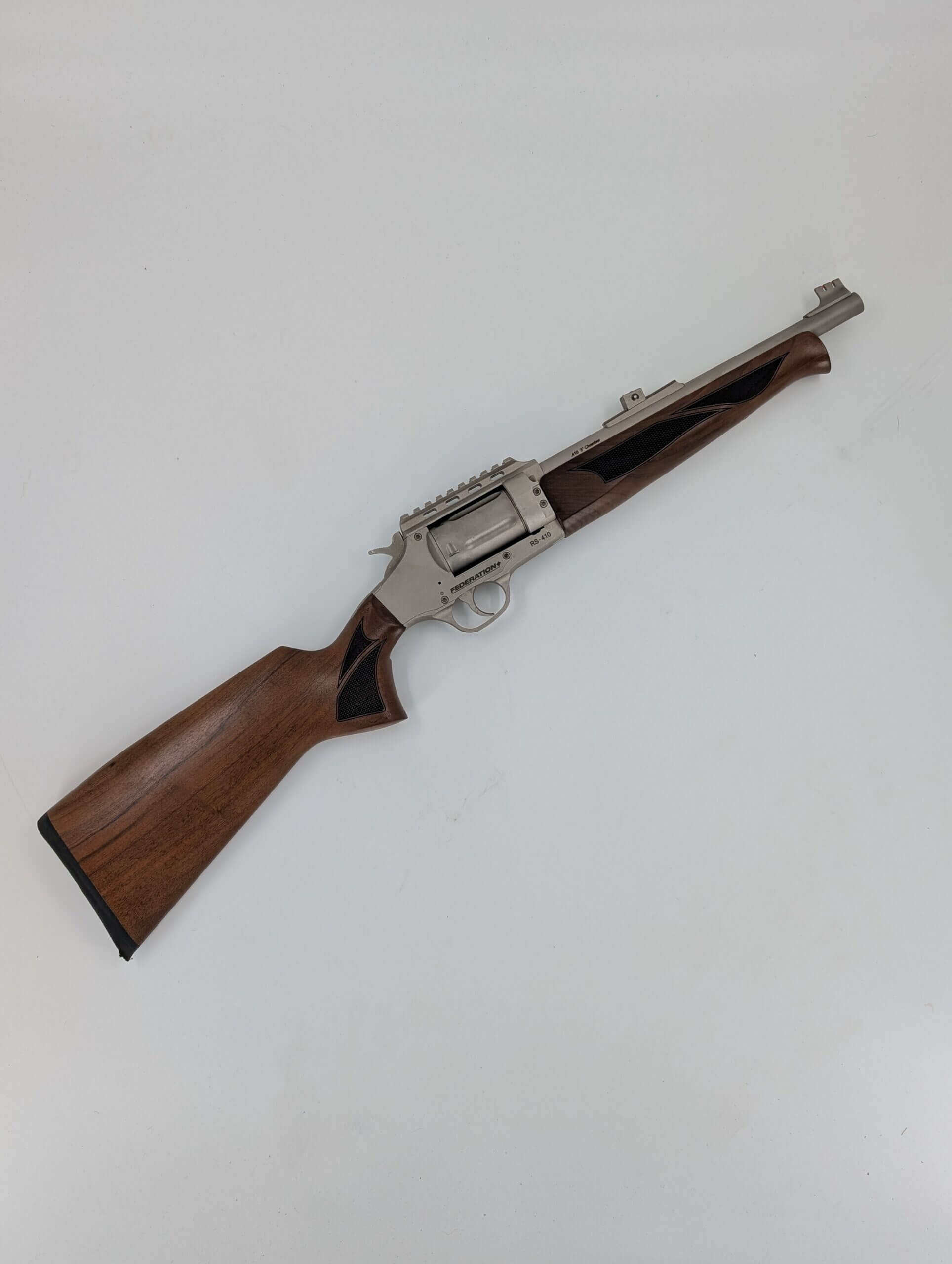 Federation Firearms RS-410, .410ga 3″ revolver action shotgun, 12″ barrel, Nickel finish, Turkish walnut stock, fibre optic front sight with adjustable rear sight, 5 chokes, 2 cylinder plugs, soft carry case. Made in Turkey, non-restricted in Canada